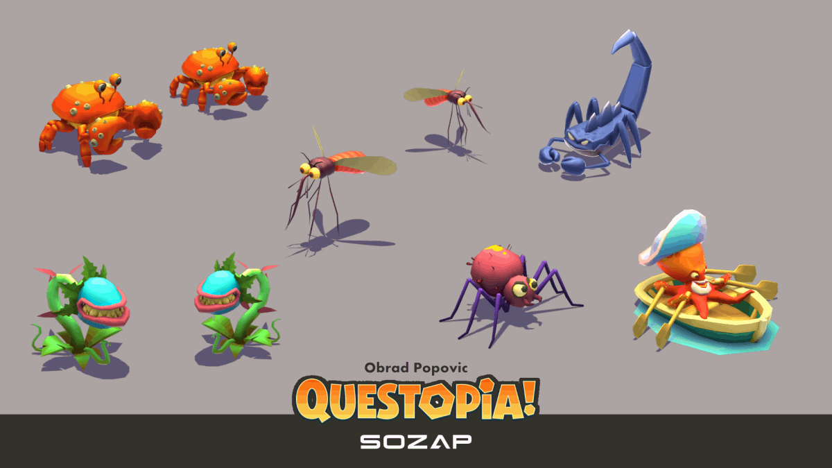 On Questopia, I owned the complete character development cycle, beginning with initial concept art and moving through 3D modeling, texturing, rigging, and animation. I also contributed to the game's atmosphere by modeling and texturing environment props.